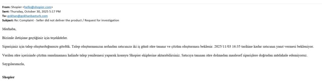 Bu maillerim sonrasında shopier.com bana 3 iş günü geçtiğini ve ödeme iadesi sürecini başlattıklarını mail ile bildirdi. Sonrasında bankam provizyondaki ödemeyi tarafıma iade etti ve sorun yaşamadan paramı iade aldım.